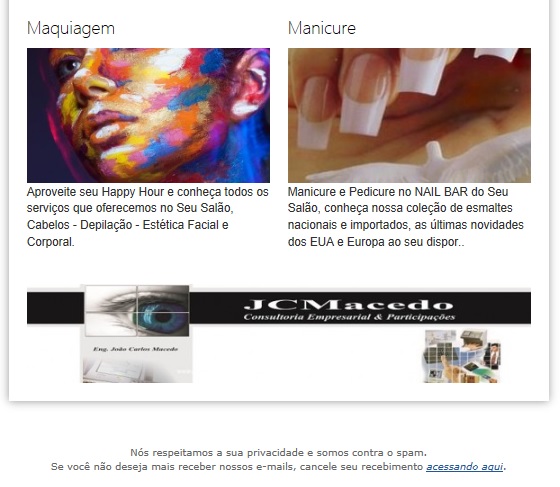 Para cada PROMOÇÃO uma NEWSLLETER como o exemplo abaixo é elaborada, tornando-se assim parte integrante de sua campanha de marketing.O Link da mensagem remete ao site de Ofertas Personalizado para seu negócio.